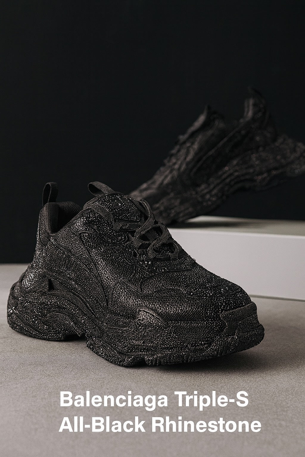 Step into luxury and bold streetwear style with the Balenciaga Track Sneaker “Black Crystal Edition.” These sneakers are crafted with meticulous attention to detail, featuring an all-black layered mesh and technical fabric construction embellished with sparkling crystal accents that add a statement shine to your every step. Designed for both fashion-forward style and long-lasting comfort, these sneakers are the perfect fusion of high-performance elements and Balenciaga’s signature avant-garde aesthetic.